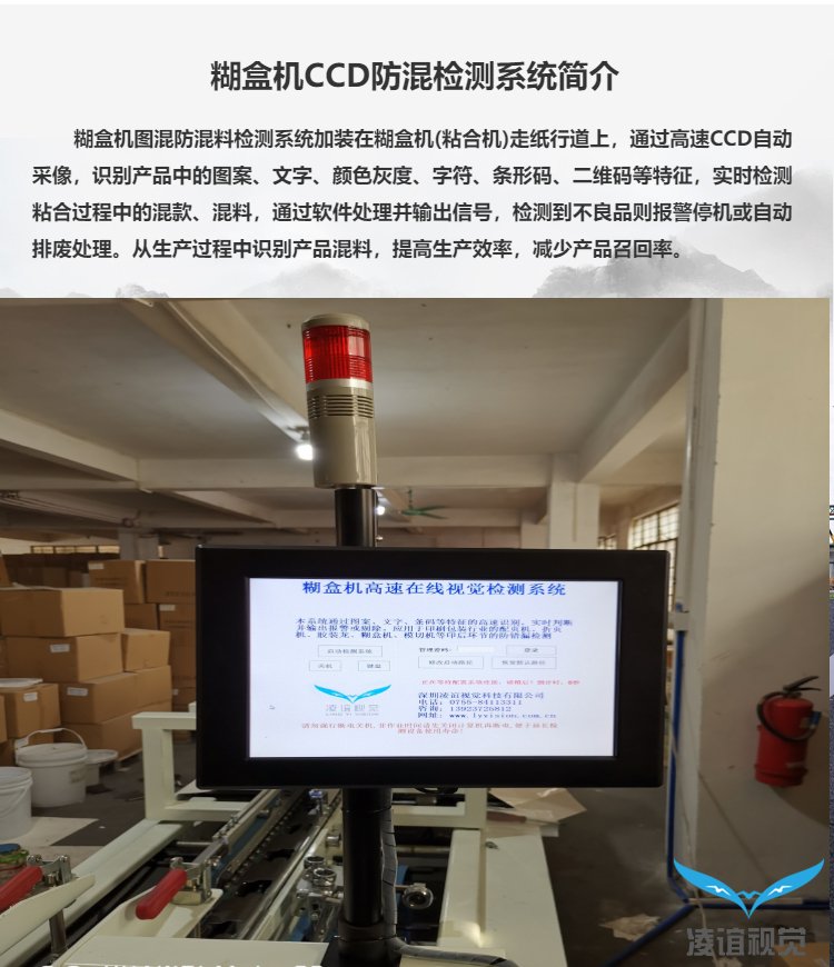 在包裝盒糊粘過程中出現(xiàn)混料、混款、印刷缺陷的問題是通過糊盒機(jī)加裝視覺檢測系統(tǒng)對表面圖文字符比對、條形碼/二維碼識別,色塊識別等方式實現(xiàn)防混及漏印檢測。
