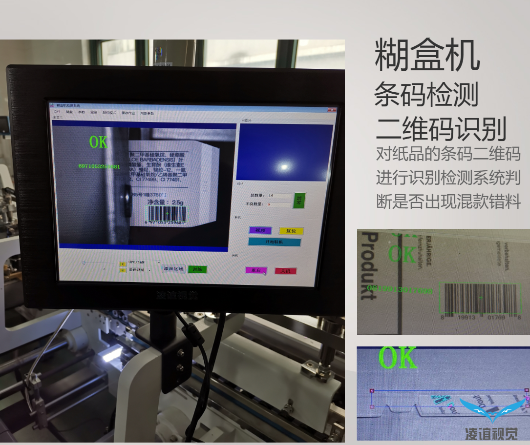 糊盒機(jī)防混料檢測系統(tǒng)是加裝在糊盒機(jī)走紙行道上,采用先進(jìn)的視覺影像識(shí)別算法和架構(gòu),可對(duì)圖案、文字、條碼、字符等多種特征進(jìn)行學(xué)習(xí)建模。軟件通過算法進(jìn)行高速識(shí)別匹配輸出控制信號(hào)。采用CCD工業(yè)相機(jī)采集圖像,比老舊的色標(biāo)傳感器、智能讀碼器兼容范圍廣,識(shí)別能力強(qiáng),不僅可以高速讀取上百種類型的條碼。還可以文字比對(duì)、鐳射圖案、色塊顏色識(shí)別等方式實(shí)現(xiàn)防混料。當(dāng)發(fā)現(xiàn)混料時(shí),可自動(dòng)停機(jī)供人工排查復(fù)位或?qū)⑿盘?hào)傳輸給剔除機(jī)構(gòu)(需要機(jī)臺(tái)具備自動(dòng)剔除功能)實(shí)現(xiàn)自動(dòng)剔除。